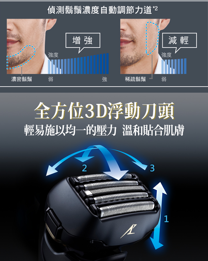 自動感測鬍量,調整刀速輸出,濃密鬍鬚也能快速剃除,乾爽俐落不費力。