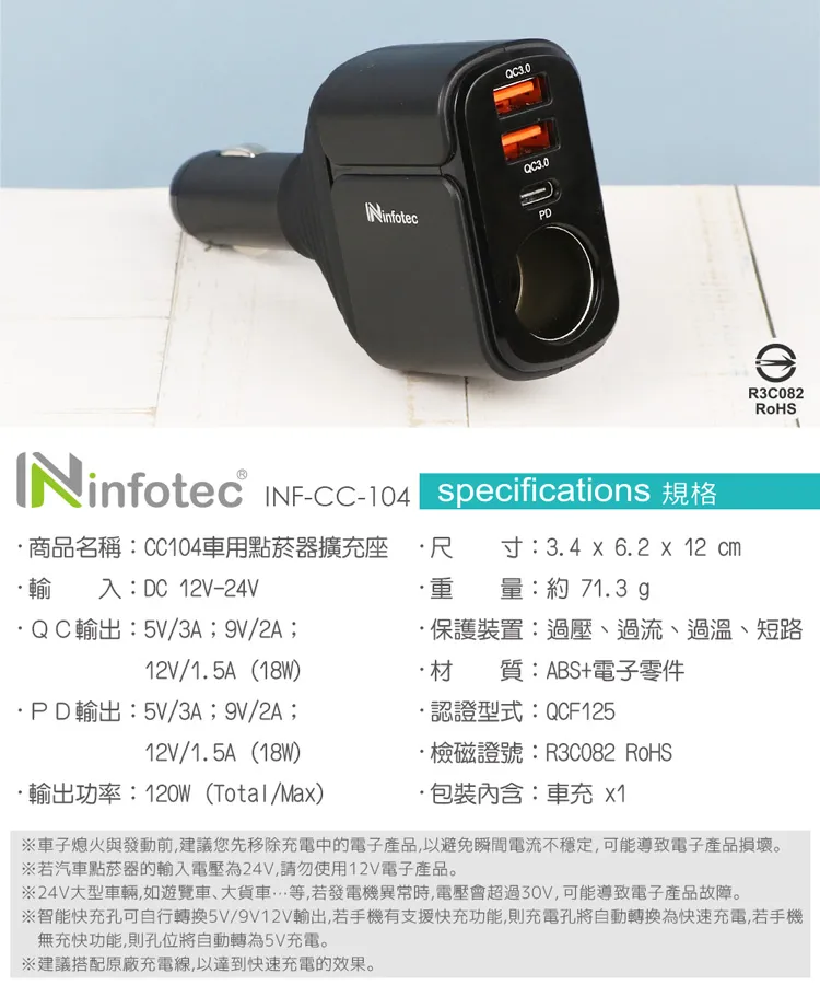infotec 英富達CC104 雙QC3.0+PD車用點菸器擴充座