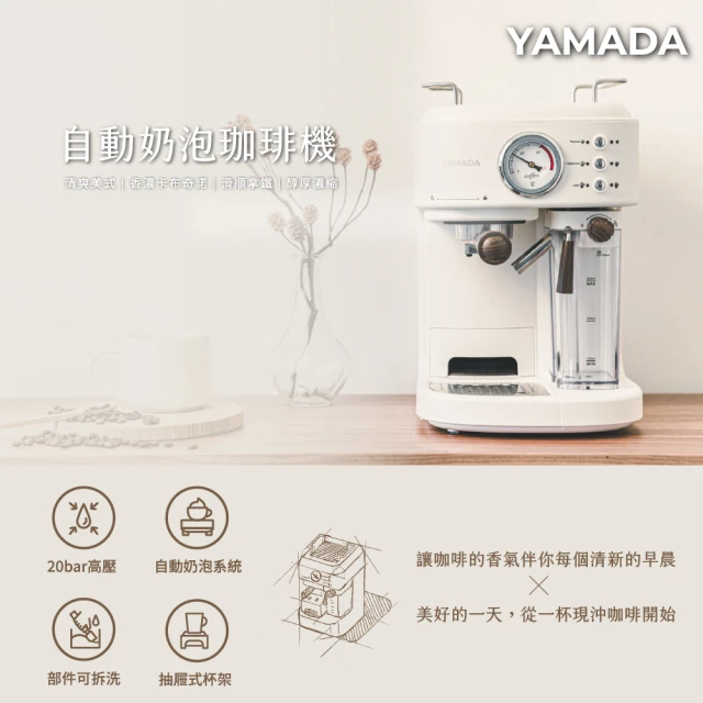 YAMADA 山田家電 20bar 高壓自動奶泡咖啡機,給你 一鍵完美萃取,從濃郁的義式濃縮到絲滑的卡布奇諾,全都輕鬆搞定。
